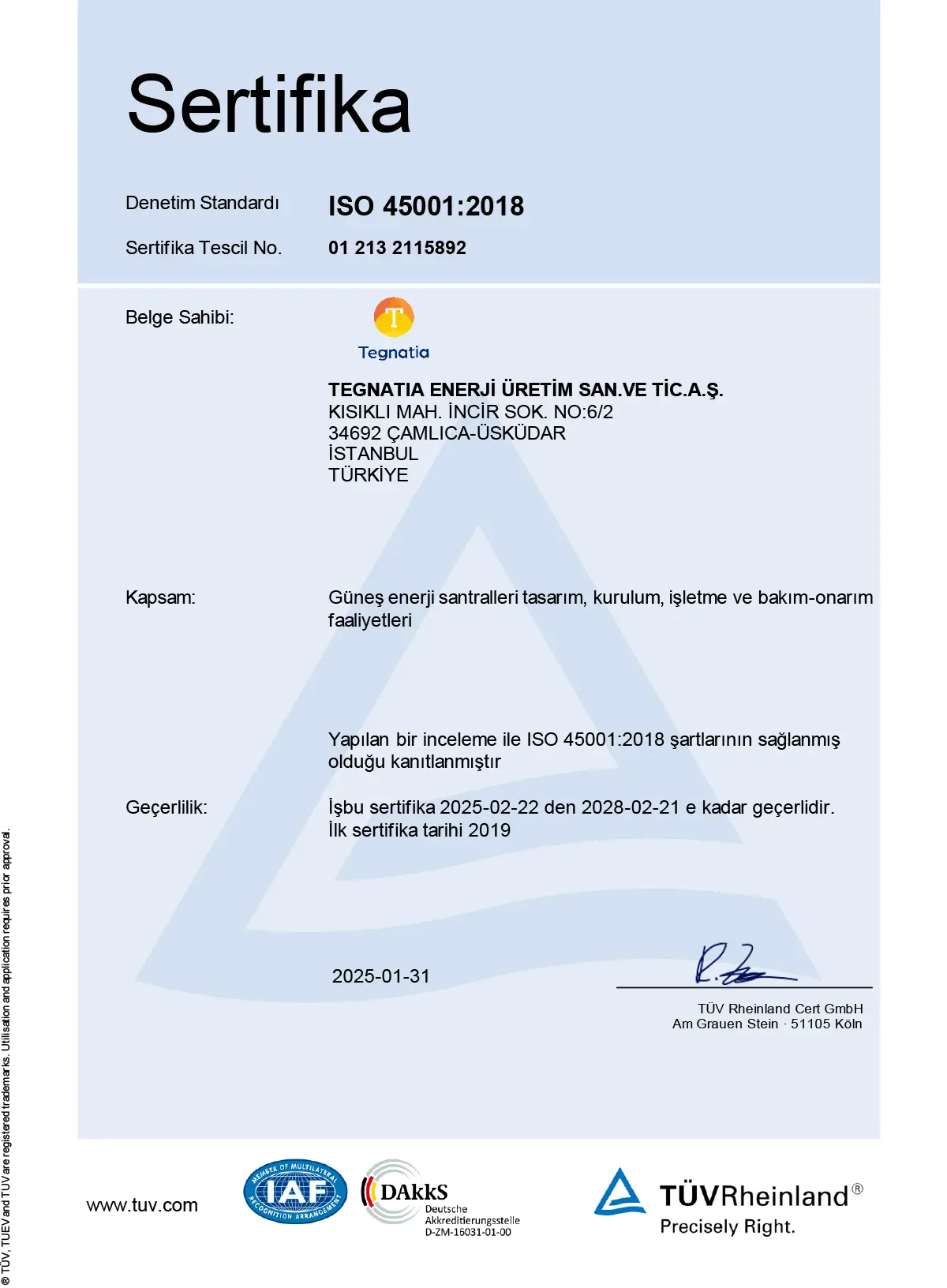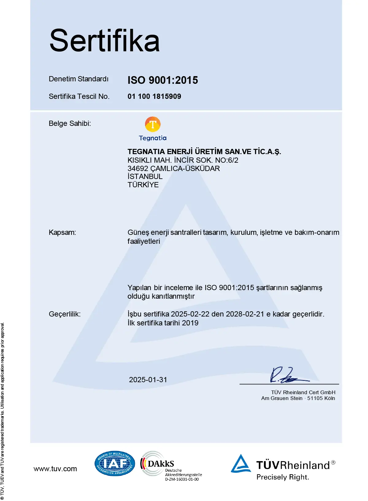 TEGNATIA Kurumsal vizyonu doğrultusunda, gelişen ve güncel teknolojileri kullanarak Güneş enerji santralleri tasarım, kurulum, işletme ve bakım-onarım faaliyetlerini gerçekleştirir. Tegnatia’nın amaç ve bağlamına uygun ve stratejik istikametini destekleyen, uygulanabilir şartları terine getirmeyi içeren, Entegre Yönetim Sisteminin etkin ve sürekli olarak gelişimini öngören, kalite, iş sağlığı ve güvenliği hedeflerinin çerçevesini belirleyen bir Entegre Yönetim Sistemi politikası Üst Yönetim tarafından oluşturulmuş, politikanın tüm ilgili tarafların erişimine açık hale getirilerek anlaşılması ve uygulanması sağlanmıştır.